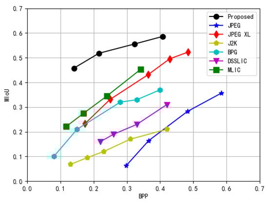 In Figure 4, we compared various image compression methods at different BPP using MIoU as the primary evaluation metric. The results confirm that the proposed method outperforms all alternatives across the entire bitrate range.