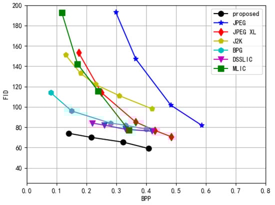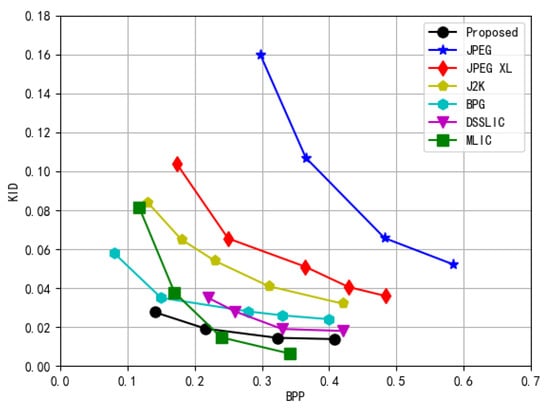In Figure 5 and Figure 6, we compared the perceptual quality of various image compression methods at different BPP using KID and FID as evaluation metrics. Lower KID and FID values indicate smaller distribution discrepancies between the reconstructed and original images, reflecting higher perceptual quality.