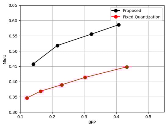 To examine the effectiveness of the reinforcement learning (RL)-based quantizer, a comparative experiment was conducted by replacing it with a fixed quantization strategy. In the fixed setting, a constant quantization level was applied uniformly across all residual components, without considering semantic importance. As illustrated in Figure 8, the proposed RL-based quantizer consistently achieves higher mean Intersection over Union (MIoU) values across different bit-per-pixel (BPP) settings compared to the fixed approach. This improvement is particularly noticeable under lower BPP conditions, where efficient bit allocation becomes crucial. The adaptive quantization policy learned via RL focuses bits on semantically significant regions, leading to a more accurate reconstruction in terms of semantic fidelity. These findings underscore the contribution of the RL module to the overall performance of the framework.