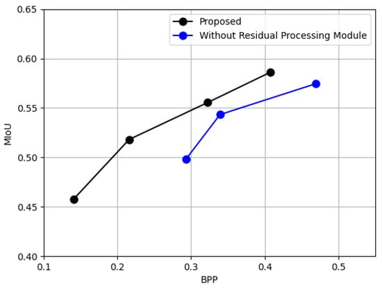 The second ablation experiment aimed to evaluate the influence of the residual processing module on semantic reconstruction performance. This study compares the proposed method, which integrates the residual processing module, with an ablated variant that excludes it entirely. By removing residual processing, the system no longer benefits from selective zeroing or semantic-guided filtering of less significant information. The experimental results, presented in Figure 9, show a noticeable decline in performance when the residual processing module is excluded. This finding confirms that the residual processing module is instrumental in balancing compression efficiency with semantic fidelity. By discarding uninformative residuals while retaining significant details, the module helps maintain higher accuracy in downstream semantic tasks, thereby reinforcing its value within the overall framework.
