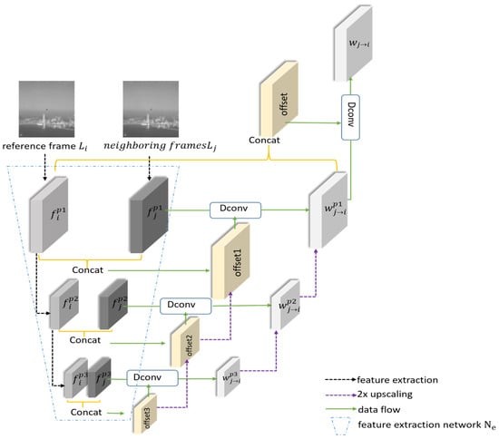 - We employ a deformable convolutional network to directly learn alignment and motion information between adjacent infrared video frames. Deformable convolution allows for local deformations to be learned for each pixel, enabling convolutional kernels to adaptively correspond to the shape and structure of the target, which can better preserve fine-grained details in the image, especially in cases of small motion displacement, as is often encountered in infrared videos.
