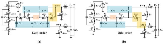 The proposed QCSC-TLAHD topology comprises N + 5 power switches (), N flying capacitors (), and two output inductors (, ), as depicted in Figure 1. The interconnections of the power devices differ between even- and odd-order QCSC-TLAHD converters. In even-order converters, as shown in Figure 1a, and flying capacitors are connected to and , respectively, with connected to , whereas in odd-order converters, each inductor is connected to flying capacitors, with connected to , as illustrated in Figure 1b. These variations directly result in differing amounts of charge transfer and paths in the capacitor networks of the even- and odd-order converters.