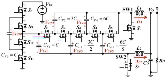 In Figure 3a, during , the transferred charges for are q, q, , , , and , respectively. In Figure 3b, during , the charges are , , , , , and . Here, the positive and negative signs indicate the accumulation and release of charges in the flying capacitors. Thus, the intrinsic charge ratio for is (1: 1: 2: 2: 2: 2). During , three parallel capacitor branches (, , and ) collectively supply charge to . As shown in Figure 3a, relative to node SW2, the voltage changes across the branches are , , and . If Equation (22) holds, each flying capacitor will transfer charge according to the intrinsic ratio during , resulting in identical voltage variations across each branch.