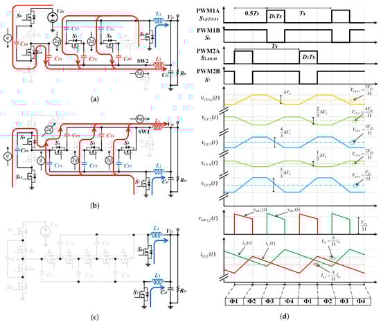 This section explores the operating principle of the proposed topology using a six-order QCSC-TLAHD converter, as shown in Figure 2. The converter consists of 11 power switches (–), 6 flying capacitors (–), and 2 inductors (, ). During one working period , the converter undergoes four operation phases (–), with the corresponding equivalent circuits and ideal operational waveforms illustrated in Figure 3. The figures detail the ON-OFF states of the switches, the charging and discharging of the capacitors, and the variations in the current in the inductors. Based on the operating phases, the active components are divided into two groups, with each working with a 180-degree shift: (1) rectifying switches , , , and and the freewheeling switch and (2) rectifying switches , , , , and and the freewheeling switch . These switches manage the charging and discharging of the flying capacitors. As shown in Figure 3d, the duty cycles of the drive pulses for switches and are and . The drive signals for the freewheeling switches and , in turn, are complementary to these two signals, respectively. For simplification, the dead time is ignored. Due to the DC blocking effect of the capacitors, the voltage swings at switch nodes SW1 and SW2 are reduced significantly, effectively addressing the issue of an extremely small duty cycle under a high voltage conversion ratio. Assume the voltages of the flying capacitors – are –, with their steady-state DC bias voltages denoted as –. The currents and in inductors and increase and decrease alternately with a 180-degree phase shift. Although the following analysis is based on an even-numbered six-order QCSC-TLAHD converter as an example, the process can be extended to other N-order converters.