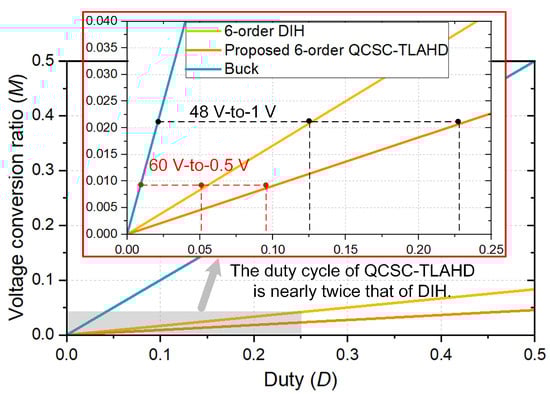 According to (11), the proposed converter achieves a duty cycle extension by a factor of . Figure 4 illustrates that the Buck converter exhibits a significantly small duty cycle under large-ratio voltage conversion. For the same ratio M, the duty cycle of the QCSC-TLAHD converter is almost twice that of the DIH converter [24]. This feature allows for precise output voltage control.