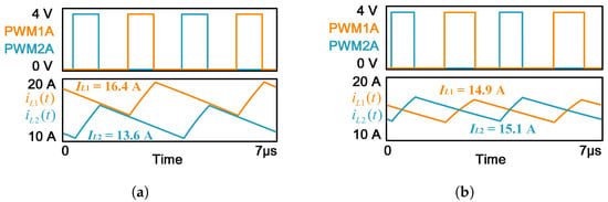 When the inductors and in Figure 1 operate in freewheeling mode (in ), they experience a reverse magnetizing voltage of . In a steady state, the variation in the inductor current during this duration constitutes the current ripple. By applying the induced voltage formula combined with (11), the current ripples and can be determined as