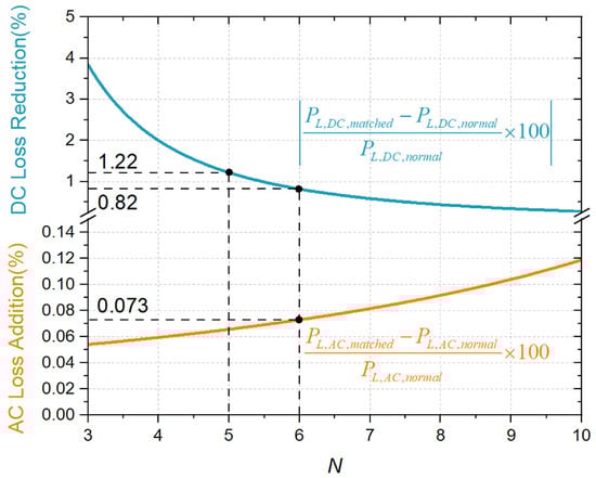 In the typical 48 V-to-1 V conversion application (M = 1/48), by comparing Equations (17) and (18) as well as (20) and (21), the trends in the inductor’s DC and AC losses before and after duty cycle matching can be determined, as shown in Figure 6. As the order N decreases, the optimization effect of inductor current equalization on the DC loss becomes more apparent. For five- and six-order converters, the reduction in the DC loss can reach 1.22% and 0.82%, respectively. Figure 6 also shows that the increase in the AC loss after duty cycle matching for the six-order converter is only about 0.073%, which can be ignored. Theoretically, the core loss can be calculated using Steinmetz’s formula. However, inductor manufacturers often do not provide parameters for the magnetic core material. Taking IHLP-3232DZ-01 0.47 µH as an example, the inductor losses of a six-order QCSC-TLAHD converter with 48 V to 1 V, = 30 A, and a 300 kHz frequency are calculated using VISHAY’s calculation tool [32]. The results are shown in Table 2: the core and AC losses each increase by 1 mW, while the DC loss decreases by 12 mW, leading to a total loss reduction of 10 mW.