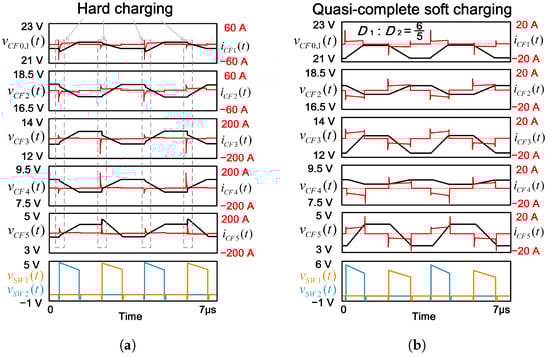Figure 7 illustrates the simulated waveforms of the flying capacitor voltages , currents , and node voltages for a converter operating with 48 V to 1 V, a 30 A output current, and a 300 kHz switching frequency. In Figure 7a, equals , and the capacitance of all of the flying capacitors is 2 µF. In Figure 7b, duty cycle matching is performed, and the optimized values of – are 1 µF, 1 µF, 3 µF, 1.5 µF, 6 µF, and 1.2 µF, respectively. As shown in Figure 7, the simulations reveal that the surge currents are significantly reduced following capacitance optimization. Specifically, before optimization, the surge currents could reach approximately 170 A, whereas after optimization, they consistently remained below 20 A. This substantial reduction in the surge currents indicates that the flying capacitors have entered a quasi-complete soft charging state, thereby minimizing the losses caused by the charge redistribution during switching transitions. This optimization contributes to improving the conversion efficiency. Figure 7a demonstrates that without capacitance optimization, abrupt changes in voltage occur for the flying capacitors during switch transitions, leading to spike currents and resulting in hard charging of the capacitors. Figure 7b shows that after capacitance optimization, quasi-complete soft charging of the flying capacitors can be achieved.