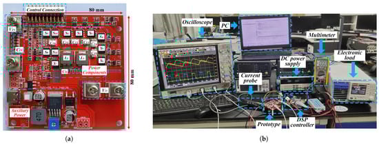 To verify the feasibility of the proposed topology, a prototype of the six-order QCSC-TLAHD converter was implemented to convert 48 V into 0.5–2.0 V. The prototype and experimental platform are illustrated in Figure 8a and Figure 8b, respectively. To validate the principle of duty cycle matching to equalize the average inductor current, it is essential to flexibly control the ratio of and and generate high-frequency drive pulses. In this study, the TMS320F28335PGFA microcontroller from Texas Instruments, featuring high-precision PWM, serves as the controller. Table 1 specifies the ratio of to as 6:5. To achieve quasi-complete soft charging, the capacitance optimization is guided by (26), while the selection of the capacitors for other-order converters can be determined using (25), (29), and (31). The list of key components is presented in Table 4.