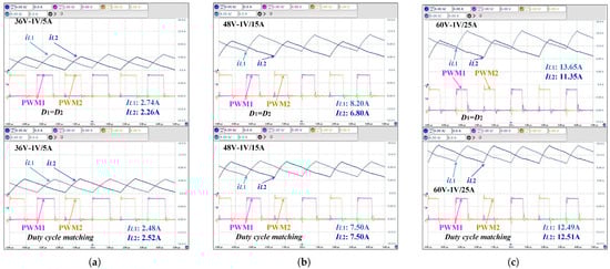 Experimental waveforms of the inductor currents before and after duty cycle matching at an operating frequency of 300 kHz for (a) 36 V-to-1 V, 5 A; (b) 48 V-to-1 V, 15 A; and (c) 60 V-to-1 V, 25 A.