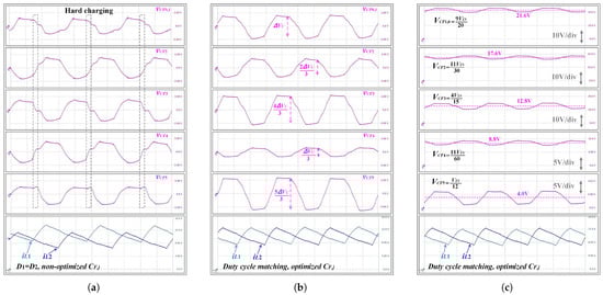 Experimental waveforms of flying capacitor voltages and inductor currents before and after duty cycle matching at 48 V-to-1 V/20 A and a 300 kHz frequency. (a) , = 4 × 0.47 µF, (b) duty cycle matching, capacitance optimization (ripple), and (c) duty cycle matching, capacitance optimization (average).