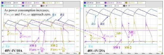 Figure 5 depicts simulated waveforms of the inductor currents for the six-order QCSC-TLAHD converter operating at 300 kHz and 48 V-to-1 V with a 30 A load. When , it is evident that . After duty cycle matching, and are approximately equal, demonstrating that matched duty cycles result in an adjusted current distribution in . Additionally, in Figure 5b, the rising slope of is greater than that of , confirming that after duty cycle matching, which is consistent with the expressions in Table 1.