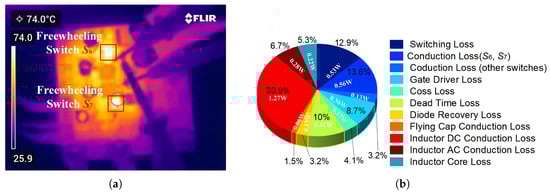Under natural convection, temperature measurements are taken using an infrared thermometer for the converter operating at 300 kHz with 48 V to 1 V and an output current of 30 A. Figure 12a indicates that the highest temperature in the measured area is approximately 74.0 °C. Two distinct hotspots are observed at the positions of the freewheeling switches and , which carry a significantly higher current than all other power switches, as shown in Figure 12b. The power loss breakdown of the converter is shown in Figure 12b. The power switch losses, including the conduction loss, switching loss, and drive loss, can be analyzed according to the method outlined in [35]. The calculation method for ESR loss in flying capacitors is provided in [36]. Inductor-related losses can be calculated using the integrated power inductor calculation tool offered by VISHAY [32]. To ensure the safe operation of the power switches and minimize conduction losses in the body diode, a dead time of 50 ns is implemented. The gate drivers are powered by a 15 V auxiliary supply, which guarantees reliable conduction of the high-side switches (accounting for the drop in voltage of the bootstrap diode) and ensures the low-side switches operate within their specified voltage range. The loss analysis reveals that freewheeling switches and contribute approximately 13.6% of the total loss, making them the most lossy active devices. This also explains why and become hotspots in Figure 12a. Additionally, the inductors’ losses are the largest, accounting for approximately 42.9%, making them a key focus for improving the conversion efficiency.