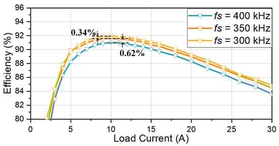 Figure 13 depicts the measured efficiency curves of the converter, which converts from 48 V to 1 V, at different operating frequencies after duty cycle matching and capacitance optimization. As the frequency decreases, the conversion efficiency increases. This improvement is primarily attributed to quasi-complete soft charging of the flying capacitors, which facilitates the elimination of SSL resistance. As a result, reducing the frequency does not induce a significant spike current loss and also results in reduced switching losses in the transistors, consequently leading to increased efficiency. However, the decreased frequency results in an extended switching period, as noted in (37), which in turn decreases the converter’s power capacity, leading to a reduction in power density. The prototype discussed in this article operates at a frequency of 300 kHz.