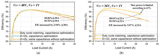 Experimental efficiency improvements following capacitance optimization at (a) 48 V-to-1 V and (b) 36 V-to-1 V.