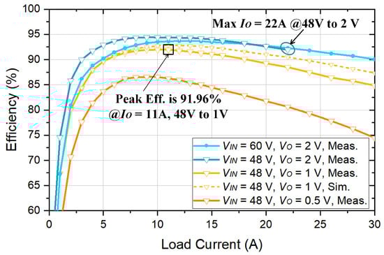 Figure 15 presents the measured efficiency curves of the converter operating at 300 kHz for various voltage conversions: 60 V to 2 V, 48 V to 2 V, 48 V to 1 V, and 48 V to 0.5 V. Figure 15 also demonstrates that under 48 V-to-1 V conversion, the measured power efficiency of the converter is marginally lower than the simulated values at high-load operation, with this discrepancy predominantly arising from unmodeled parasitic losses in the PCB trace resistance. In the typical 48 V-to-1 V application, the converter achieves a peak efficiency of 91.96% at = 11 A. Moreover, the volume of the prototype’s components is quantified as 0.0635 in3. The converter attains a power density of up to 944.88 W/in3.