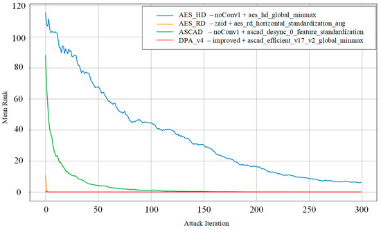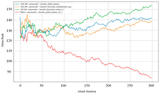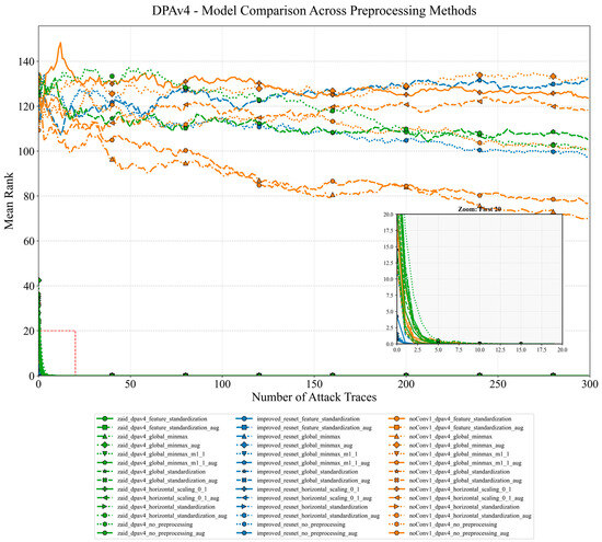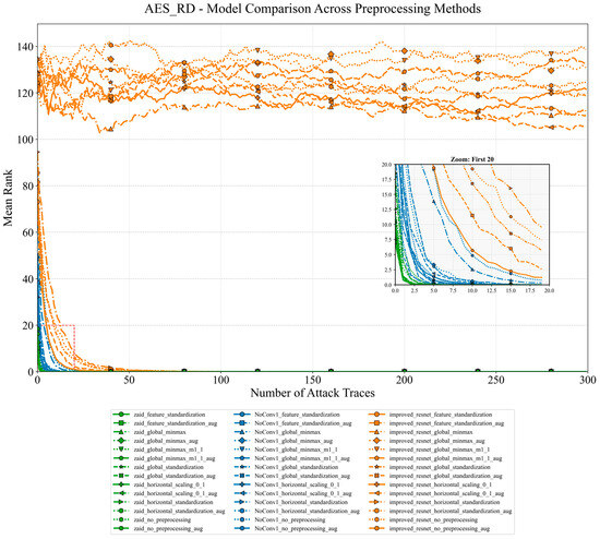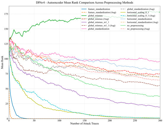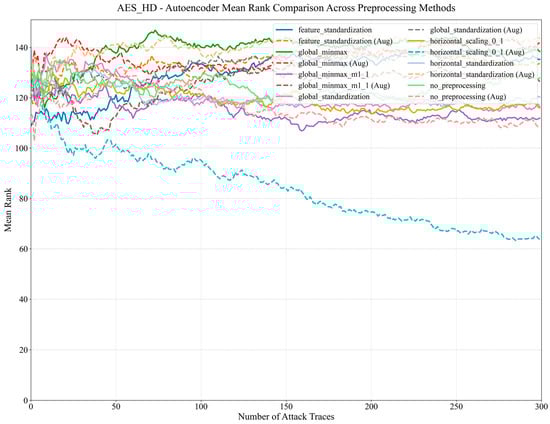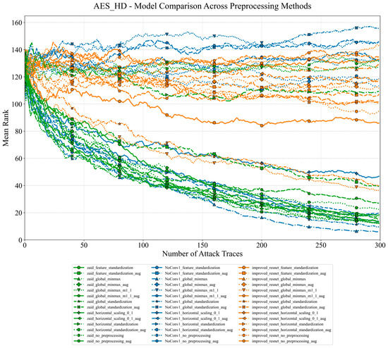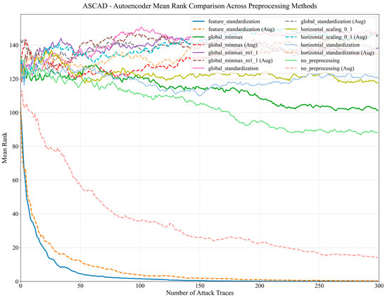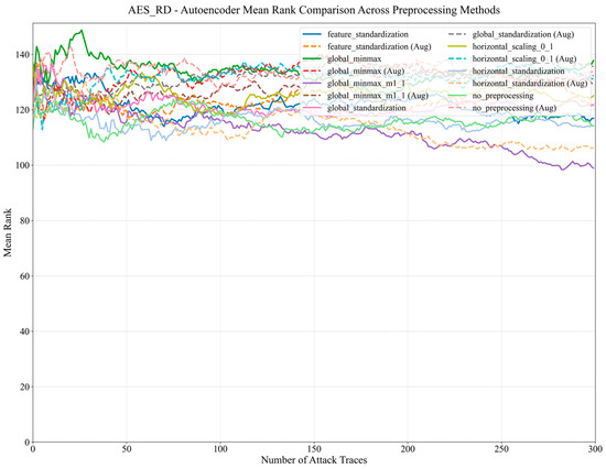 Figure 2 demonstrates that nearly three-quarters of the number of the three methods with added preprocessing and data enhancement operations achieve the target classification results on the DPA_v4 dataset. Among them, Simplified Efficient CNN fails more. This validation result is surprising; it may be because the number of its parameters is too small, resulting in insufficient sensitivity to the feature recognition of data preprocessing and data enhancement. A comparison of Figure 3 shows that the ResNet network based on residual structure (named improved_resnet) and the feature encoding CNN network (named autoencoder_classifier) proposed in this paper have the best overall results. The effective method achieves the number of curves used to achieve the average rank of the correct key assumption in the course of responding to the 300 validation attacks is less than 10, demonstrating that preprocessing and data augmentation does have a positive effect on the optimization of high-parametric quantitative models, with feature normalization having the most significant effect.