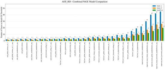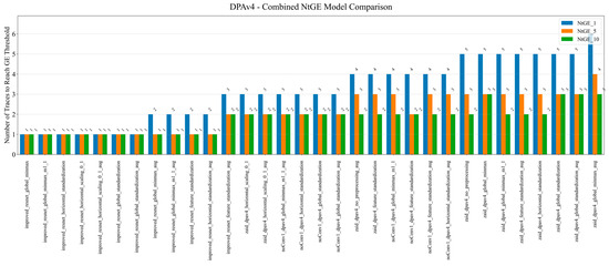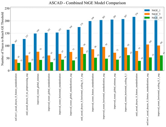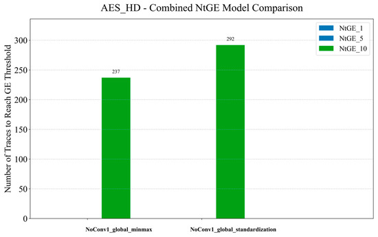 Secondly, the comparison results of the four modeling methods combined with seven preprocessing operations and the application of data enhancement, evaluated under the NtGE thresholds {1, 3, 5, 10}, are presented in Figure 10, Figure 11, Figure 12, Figure 13, Figure 14 and Figure 15. The ideal target for each threshold setting is to achieve a value of 1. Experimental results demonstrate that on the DPA_v4 and ASCAD datasets, the proposed methods show clear advantages, with a significant reduction in the number of traces required to meet the thresholds. In particular, feature normalization and data enhancement consistently contribute the most to performance improvements across these datasets. In contrast, for the AES_RD and AES_HD datasets, which involve strong masking countermeasures and high noise levels, respectively, the methods proposed in this paper have not yet achieved optimal results. This indicates that further refinement of model parameters and architecture may be necessary to address more challenging protected or noisy scenarios.