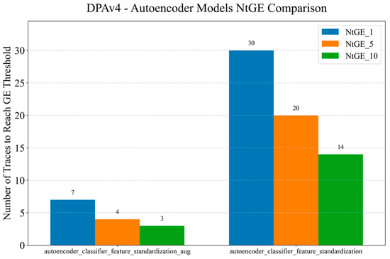 Number of traces required for feature encoding CNN to reach the NtGE threshold on the DPA_v4 dataset.