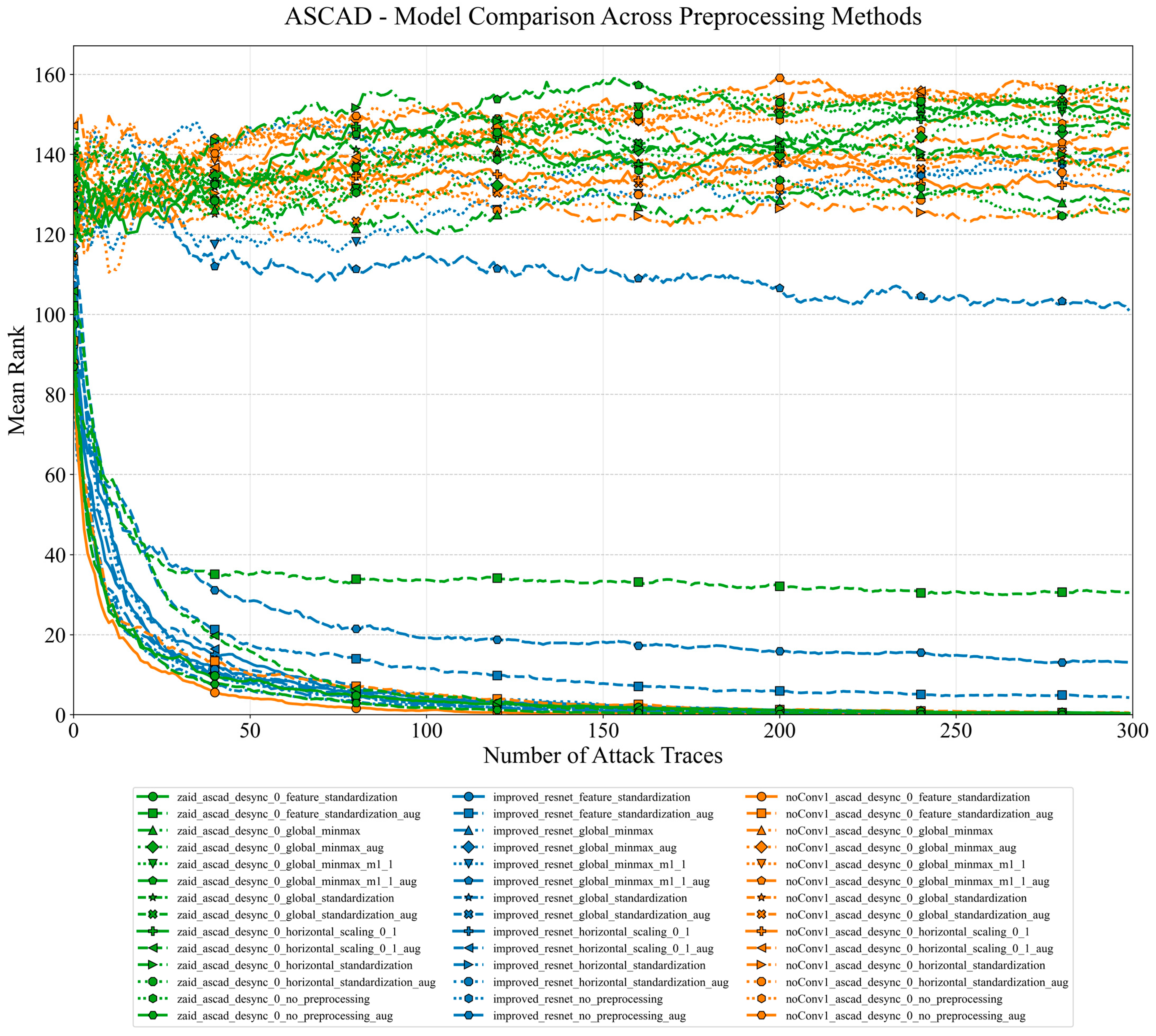Variation in the average rank of the correct key hypothesis for three methods on the ASCAD dataset as the number of traces used for the attack increases.