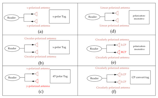Working principles of linearly, polarization-insensitive, and circularly polarized tags. (a) Linear tag with linear reader, (b) Linear tag with circular reader, (c) 45° linear tag with linear reader, (d) Polarization insensitive tag with linear reader, (e) Polarization insensitive tag with circular reader, (f) Circularly polarization convert tag with circularly reader.