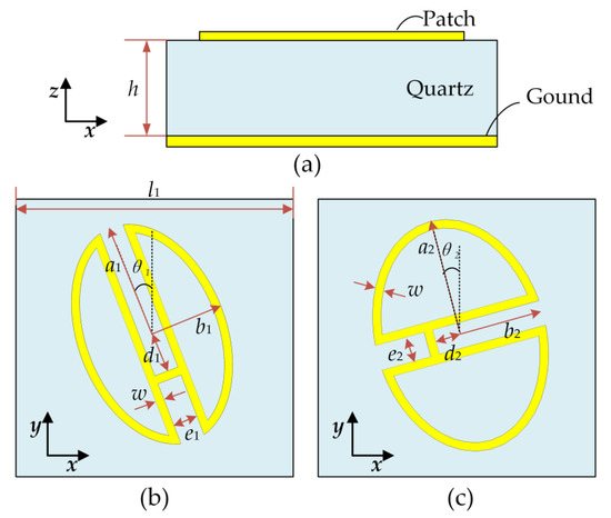 Two geometric phase elements with different structures were designed. The structures of the two elements are shown in Figure 2. Both elements consist of a patch layer, a quartz dielectric layer, and a metal ground layer with the same thickness. The patch layer is composed of two semi-ellipses linked by a strip line. The linked-semi-ellipses in Element 1 are separated along the major axis, while those in Element 2 are separated along the minor axis. The major and minor axes of Element 1 are a1 and b1, respectively, and those of Element 2 are a2 and b2. The geometric phase of the elements is altered by rotation, with the rotation angles θ1 and θ2, respectively. The dynamic phase shift of the elements is adjusted by modifying the dimensions of the major and minor axes, ensuring that the geometric phase difference of the two elements remains at 90°. Additionally, dispersion is controlled by adjusting parameters d1 and d2, enabling the two elements to maintain a stable 90° phase difference over a relatively broad bandwidth. The dimensions of the element structures are shown in Table 1. The linked-semi-ellipses of Element 1 are arranged horizontally, while those of Element 2 are positioned vertically. According to Equation (2), a 90° rotation leads to a 180° in the reflection phase, which results in a 360° phase difference between the two elements. Consequently, the 90° rotation of the element does not influence the phase difference.