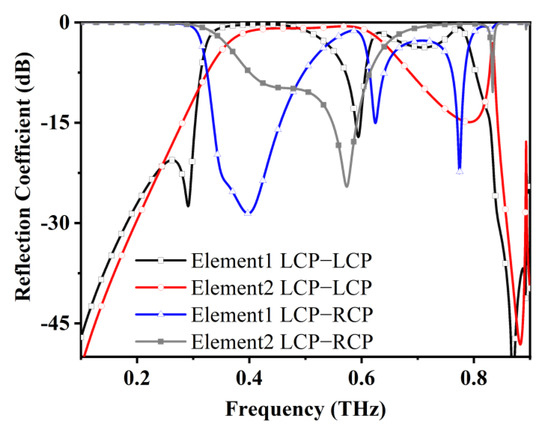 The reflection responses of the proposed elements were simulated using the Floquet mode in CST Studio Suite to conduct a comprehensive full-wave electromagnetic analysis. The simulated results, illustrated in Figure 3, detail the reflection characteristics under the illumination of an LCP wave. For Element 1, the reflection coefficient for LCP-LCP remains consistently below −1 dB over the frequency range of 0.34–0.53 THz. Similarly, for Element 2, the reflection coefficient remains below −1 dB across the range of 0.42–0.60 THz. Therefore, both tags demonstrate a polarization conversion rate exceeding 80%, particularly within the overlapping frequency range of 0.42–0.53 THz. Given that the reflection coefficient characteristics for RCP waves are theoretically symmetric to those of LCP waves, the corresponding simulation results for RCP incidence are omitted for brevity.