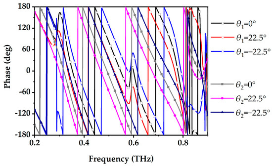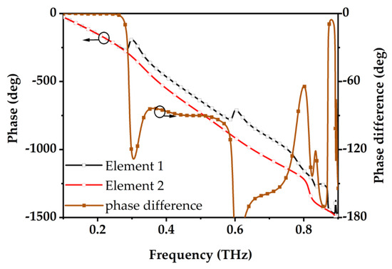 When the rotation angles of the two elements are set to 0° (θ1 = 0°, θ2 = 0°), we compared the simulated reflection phases of the LCP-LCP, as shown in Figure 4. The results display the phase difference between Element 1 and Element 2. Due to structural variations, a dynamic phase difference arises between the two elements. Within the frequency range of 0.42–0.53 THz, this dynamic phase difference remains consistently stable at 90°, with a phase error magnitude of less than 2°.