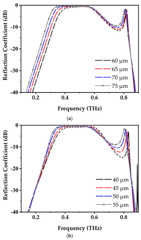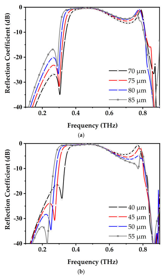 Simulated reflection coefficient: (a) Element 1 with varying d1; (b) Element 2 with varying d2.