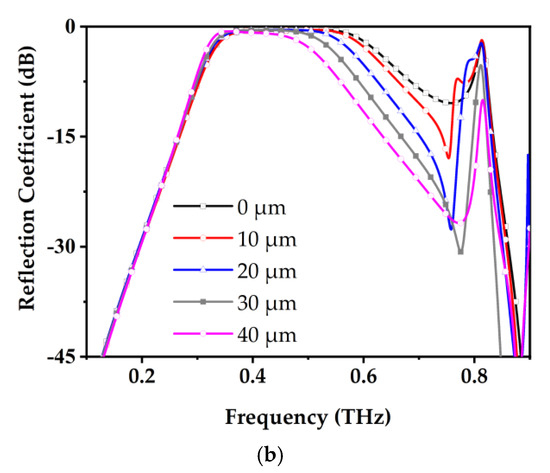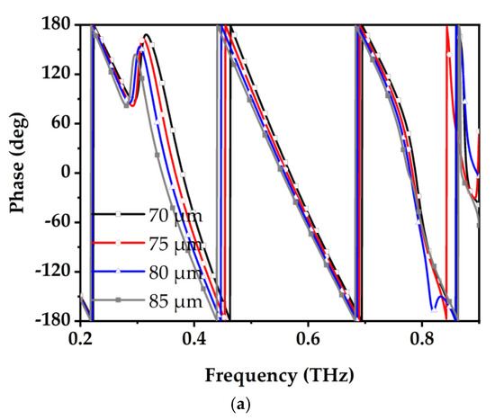 Simulations were performed to examine the influence of d1 and d2 on the elements’ phase and dispersion characteristics. The simulation results for varying the size of d1 in Element 1 are shown in Figure 12a. As d1 increases, the dispersion variation within the operational frequency range remains minimal, while the relative phase change becomes more pronounced. At 0.45 THz, the phase variation with d1 is approximately 0.5°/μm, while the dispersion variation with d1 is about −2.2°/(THz μm). Conversely, as shown in Figure 12b, the simulation results for varying d2 in Element 2 reveal significant changes in dispersion characteristics. At 0.45 THz, the phase variation with d2 is approximately 0.8°/μm, while the desperation variation with d2 is −6.1°/(THz μm). Precisely controlling the relative phase between the two elements could be achieved by fine-tuning d1 and d2. The adjustment process involves modifying d2 to align the dispersion characteristics of Element 1 and Element 2. Subsequently, d1 is adjusted to maintain a phase difference of 90° between the two elements. The amplitude simulation results for varying d1 and d2 are also depicted in Figure 13. It is evident that as d1 and d2 increase, the polarization conversion rate of the elements decreases at higher frequencies, resulting in a minor reduction in operational bandwidth.