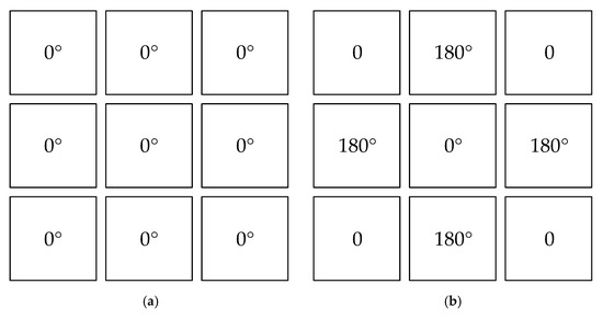 The identification tag developed in this study employs a 2-bit circular polarization encoding technique with polarization conversion capability. Its encoding mechanism is based on the sum-and-difference beam theory. In scenarios where all elements have identical reflection phases , the element reflection vectors align and add constructively in the same direction, resulting in the maximum reflected intensity . Conversely, by adjusting the reflection phases to ensure the vectors cancel each other out, the reflected intensity is minimized. By precisely controlling the phase distribution of the tag’s structural elements, a significant difference in the reflected amplitude is generated under LCP and RCP wave incidence, thereby establishing the circular polarization encoding states ‘0’ and ‘1’.