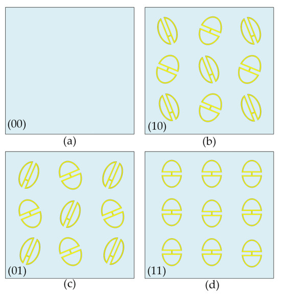 When two elements with a 90° dynamic phase difference and a 45° rotational angle difference are combined into an array, if the rotation angle is clockwise (θ1 = 45°), the tag will not reflect under LCP–LCP but will reflect RCP–RCP (01), as shown in Equations (6) and (7). When the element is rotated counterclockwise (θ1 = –45°), LCP–LCP is normally reflected, while RCP–RCP results in no reflection (10), as shown in Equations (8) and (9). The energy will be scattered in other directions rather than being absorbed by the tag. This approach enables the realization of 2-bit polarization encoding.