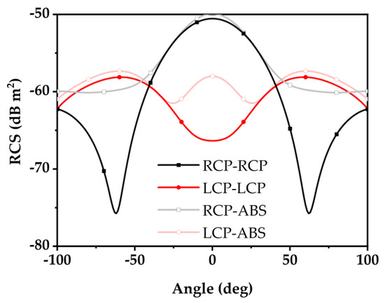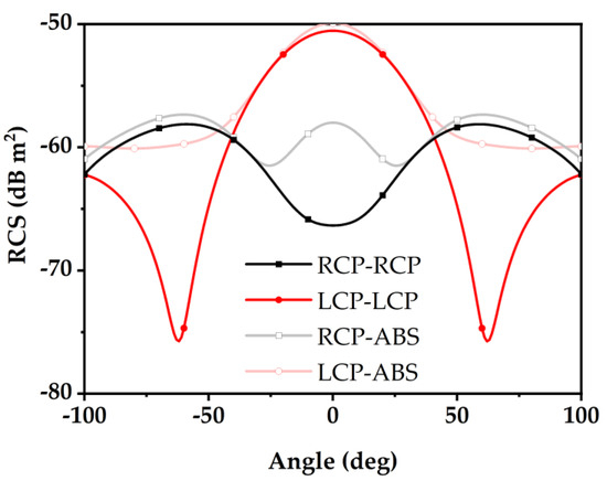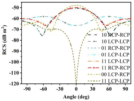 The radar cross section (RCS) pattern simulation results for tag (10) at 0.45 THz are shown in Figure 18. Under LCP incidence, the reflected energy is nearly entirely LCP, with the maximum scattering value at 0° being LCP-LCP RCS −49.9 dB·m2, a polarization conversion efficiency of 86.9%, and a 3 dB beamwidth of ±22°. Under RCP incidence, the reflected energy is predominantly scattered in the 50° direction, with an RCP-RCP RCS of −66.3 dB·m2 at 0° and a polarization conversion efficiency of 14.6%. The polarization conversion efficiency of the tag is influenced by both the element’s polarization conversion efficiency and the direct metal reflection. For RCP–RCP, the element’s polarization conversion efficiency is low, and the primary influencing factor is the coupling between the elements. The RCS radiation pattern simulation for tag (01) at 0.45 THz is shown in Figure 19. The simulation characteristics are symmetric to those of tag (10), with an error of less than 0.2 dB. The comparison of the four encoding tag reflection patterns is shown in Figure 20.