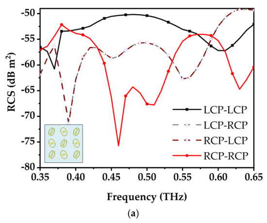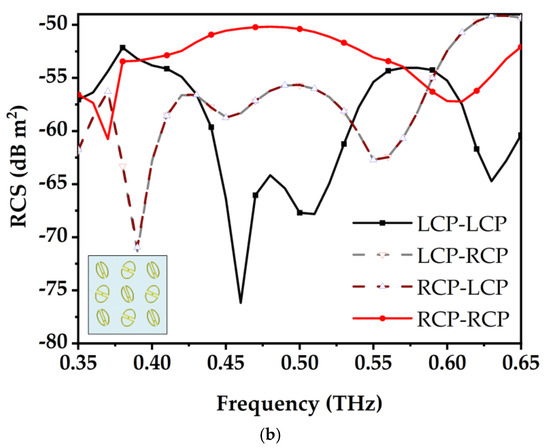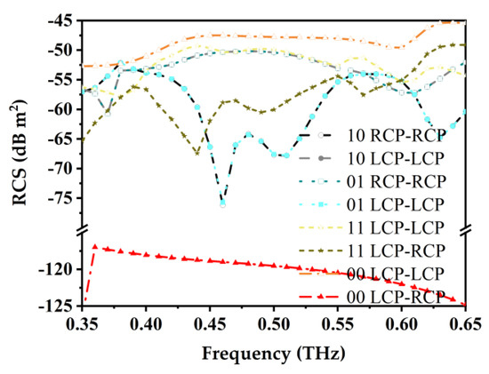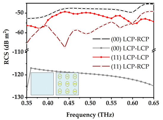 The reflected RCS frequency band of the tags under four encoding states (00, 01, 10, 11) was simulated. Encoding states (00) and (11) are shown in Figure 21. For the (00) state, the LCP-LCP reflected RCS remains below –115 dB. In contrast, for the (11) state, a significant polarization conversion occurs in the 0.41–0.54 THz frequency band, where the LCP-LCP reflected RCS exceeds –51.7 dB·m2, and the polarization conversion rate is greater than 80%. Under RCP incidence, the simulation results for state (11) are essentially identical to those under LCP incidence.
