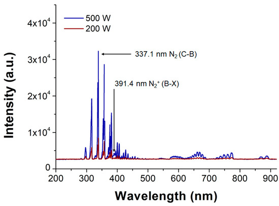 - Qayyum, A.; Zeb, S.; Ali, S.; Waheed, A.; Zakaullah, M. Optical Emission Spectroscopy of Abnormal Glow Region in Nitrogen Plasma. Plasma Chem. Plasma Process. 2005, 25, 551–564. [Google Scholar] [CrossRef]