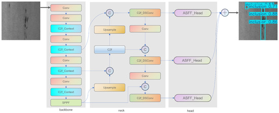To further enhance the performance of steel surface defect detection, this paper addresses the shortcomings of the classical YOLO model in multi-scale feature fusion and fine linear feature recognition by designing and incorporating several modules—namely, the Context-Guided module, DSConv, and Detect_ASFF. The improved model achieves significant performance gains in steel surface defect detection tasks, and it is expected to provide a more precise and efficient technical solution for industrial automated inspection.