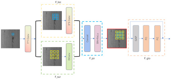 In contrast, surrounding feature extraction, denoted as , is achieved using dilated convolution. Dilated convolution introduces a dilation rate r, which selectively skips certain pixels during convolution, allowing a broader receptive field while maintaining the parameter count. The computation is expressed as follows:
