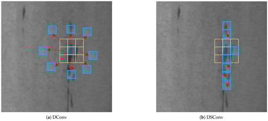 As shown in Figure 3, traditional DConv exhibits a relatively scattered and discontinuous distribution when learning offsets. This “fragmented” sampling approach struggles to effectively capture continuous pipeline-shaped defects and is susceptible to background noise and texture interference, leading to suboptimal extraction of fine linear features. In contrast, DSConv introduces a targeted design for linear and snake-like structures in its offset mechanism, ensuring that the convolution kernel’s sampling locations are more concentrated and continuously distributed along the defect body. This enables DSConv to accurately capture the edges and orientations of pipeline-shaped features. Furthermore, this offset strategy demonstrates strong robustness even in environments with complex noise, effectively reducing background interference during feature extraction. As a result, DSConv enhances detection precision and stability in steel surface defect detection, particularly for linear defects such as scratches.