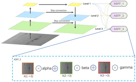 Structure of the ASFF module. Here, , , and denote feature maps originally from scale 1, scale 2, and scale 3, respectively, that have been resized and aligned to the spatial resolution of the third scale for fusion. Each input feature undergoes scale transformation to match the target resolution before adaptive weighting and combination.