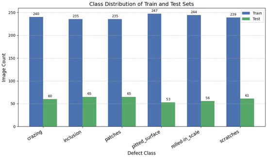 The NEU-DET is a dataset that collects images of six typical defects on steel surfaces. The defect types include crazing, inclusion, patches, pitted_surface, rolled-in_scale, and scratches [34,35,36]. This dataset comprises 1800 grayscale images, with 300 images per defect type, each originally sized at 200 × 200 pixels. Bounding boxes are used for annotation, indicating the types and locations of multiple defects present in each image. The dataset is randomly divided into training and testing sets in a 4:1 ratio. The distribution of the dataset is illustrated in Figure 6.