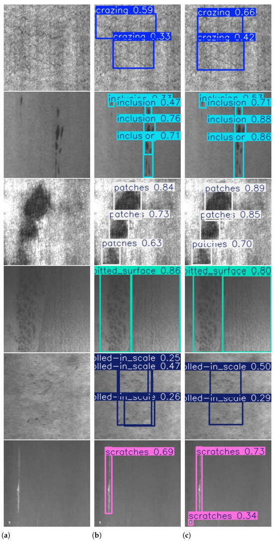 Comparison of prediction results for different defect types. (a) Original images; (b) YOLOv8n predictions; (c) DCA-YOLO predictions. From top to bottom, the rows correspond to (1) Crazing defects, (2) Inclusion defects, (3) Patches defects, (4) Pitted-surface defects, (5) Rolled-in scale defects, and (6) Scratches defects.