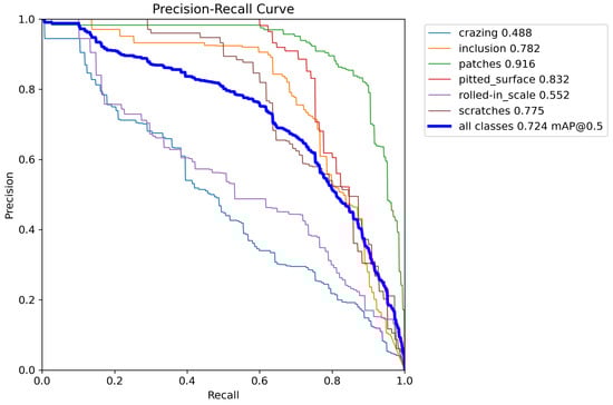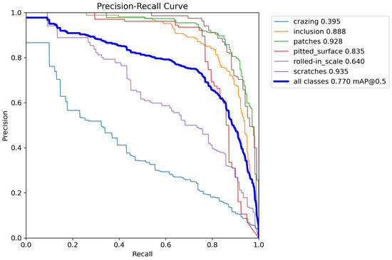This study employs Precision–Recall (PR) curves as an essential metric for evaluating the detection performance of the models. Figure 8 illustrates the PR curve of the baseline YOLOv8n model, while Figure 9 displays that of the improved DCA-YOLO model. YOLOv8n achieves a high detection performance in some defect types (e.g., patches and pitted_surface), yet its accuracy for detecting defects such as rolled-in_scale and scratches remains suboptimal, resulting in an overall mAP50 of 0.724. In contrast, the PR curves of the DCA-YOLO model demonstrate enhanced detection performance across most categories—particularly for scratches and other linear defects—ultimately increasing the mAP50 to 0.770. In summary, DCA-YOLO exhibits superior multi-scale feature fusion and local feature extraction capabilities, affirming that the integration of the three optimized modules (DSConv, Context-Guided module, and Detect_ASFF) significantly improves the performance of steel surface defect detection.