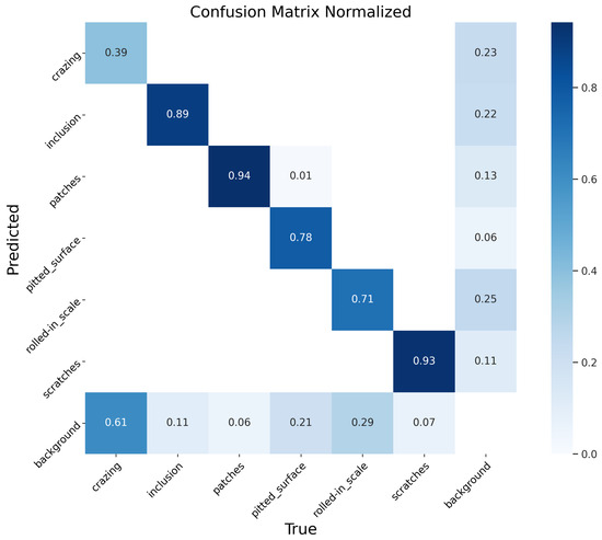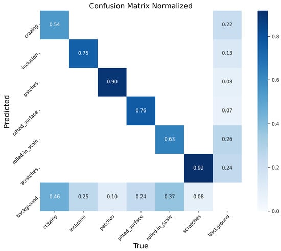 Figure 10 and Figure 11, respectively, illustrate the normalized confusion matrices of the YOLOv8n and the DCA-YOLO for steel surface defect detection. The confusion matrix visually presents the classification results across various categories and the extent of inter-class misclassifications, thereby facilitating an assessment of the models’ recognition capabilities and limitations. Notably, the baseline model demonstrates inadequate recognition for defects characterized by fine linear features, such as the rolled-in_scale category, and some defect types are erroneously classified as background. In contrast, the confusion matrix of the DCA-YOLO model reveals a higher overall classification accuracy, with a significant improvement in the challenging rolled-in_scale category and enhanced recognition performance across most categories. Overall, compared to the baseline model, DCA-YOLO exhibits superior feature extraction ability and is more effective in suppressing false positives and mitigating background interference.