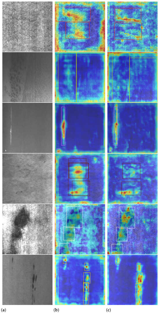 Figure 12 presents the attention distribution visualized using the Grad-CAM technique [41]. Grad-CAM tracks gradient information in convolutional layers and visualizes the activation intensity of the network for specific predictions in the form of a heatmap. This helps assess whether the model focuses on image regions that correspond to actual defect locations during object detection [42,43].