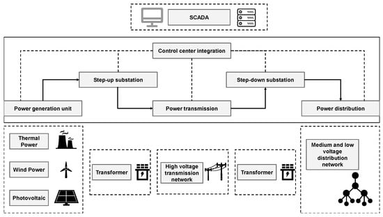 As shown in Figure 1, the power system consists of four main components: power generation units (e.g., thermal plants, wind farms, and solar farms), transmission networks (including substations and transformers), a general control center, and distribution networks connected to end-users.