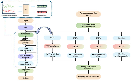 Framework of the CEEMDAN-FFT-iTransformer-LSTM model.