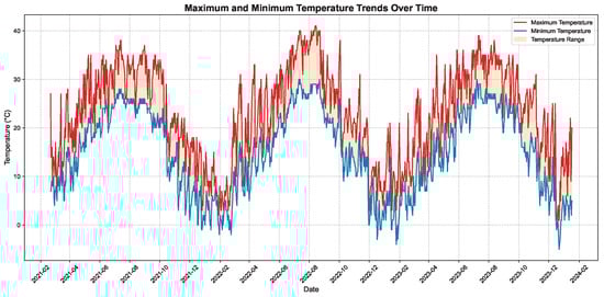 Our dataset comes from the market data of the State Grid Corporation of China (Hangzhou, China), covering daily electricity consumption records in Hangzhou from 2 February 2021, to 17 January 2024. As shown in Figure 3, the data indicate a discernible trend in electricity usage over time. And we collected weather data (including maximum and minimum temperatures) for the corresponding dates to assist with predictions, as shown in Figure 4. Due to the limited dataset size, the data were split into training and testing sets using an 8:2 ratio in the experiment.
