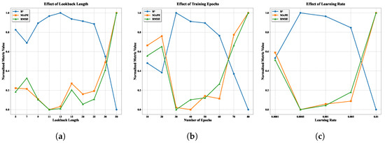 First, we determine the lookback_len parameter, which defines how many past days of data are used to predict future outcomes. We choose different fixed time window lengths and conduct experiments while keeping the other hyperparameters (learning rate = 0.001, epoch = 50) at their default values. The experimental results, as shown in Figure 5a, show the error values under different lookback window lengths. For ease of observation, we normalize all error values. A 13-day lookback window corresponds to the highest and the lowest MAPE and RMSE values, suggesting optimal model performance for this configuration. When the lookback window is less than 13 days, the insufficient number of days results in a lack of adequate feature information, leading to suboptimal performance. Conversely, when the lookback window exceeds 13 days, the excessive amount of information renders the model processing redundant, thereby affecting the prediction performance. These results show that a lookback window of 13 days is the optimal choice for this model.
