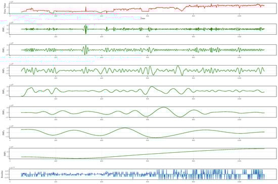 - This process is continuously repeated until the residual signal exhibits a monotonic trend, at which point the decomposition is terminated. Consequently, the original sequence is decomposed into K sub-sequences along with a residual sequence as Equation (4):where K denotes the total number of intrinsic mode functions obtained, and is the final residual signal.