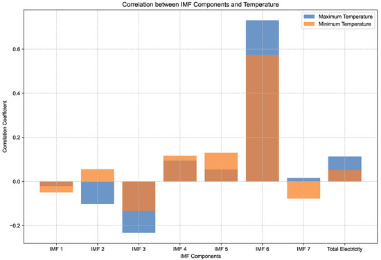 From the visual representation of the decomposition results, it can be seen that the initial IMF components (IMF1-IMF3) exhibit significant high-frequency fluctuation characteristics, while the fluctuation frequency of subsequent components (IMF4 and later) gradually becomes smoother. To deeply analyze the temporal characteristics of each IMF component and their coupling relationship with meteorological factors, this study constructed a Pearson correlation coefficient matrix between temperature parameters and each IMF component and the original total power consumption, and the results are visualized in Figure 7.